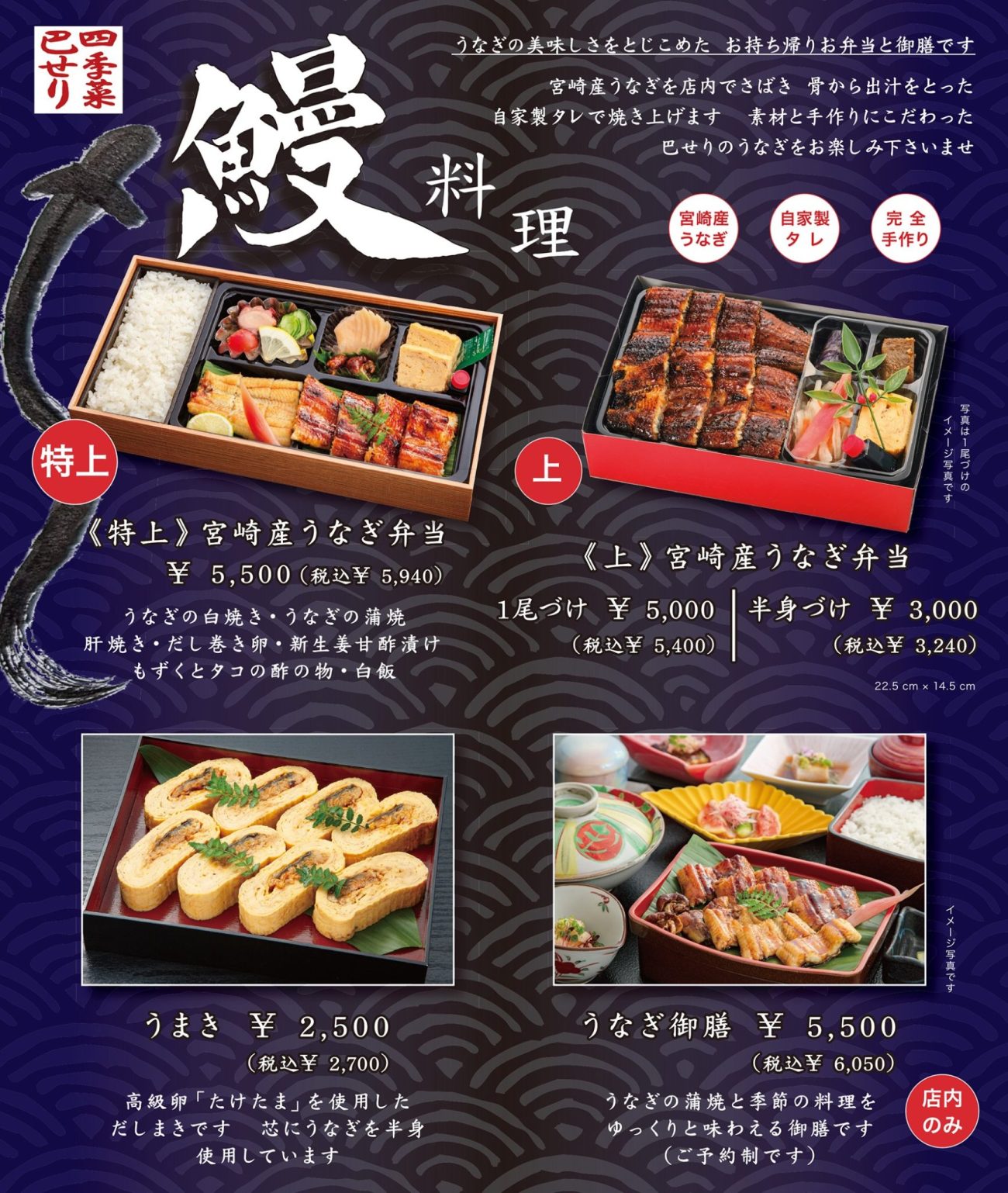 宮崎産の活うなぎを使用した「宮崎産うなぎ弁当」をご予約承っております(配達、持ち帰り用の商品です)